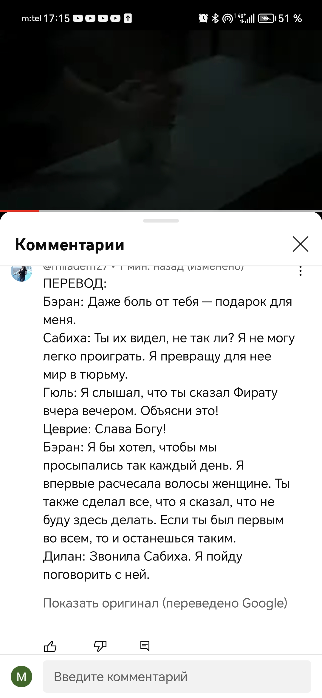 Вот и меня мучают смутные сомнения по поводу Гюльшах. Не так все просто с этой пропавшей мадмуазель, и что интересно, кобра Сабиха льет крокодиловы слёзы из-за приемной дочери, но пропускает слова о возможности , что её дочерью может быть Дилан. Да и медальончик как-то подзабылся в суете разборок с Бараном. Главное для Сабихи - разрушить отношения между мужем и женой, но чего она не учла - это то, что любовь будет такой сильной и слова самой Сабихи " Я не могу разлучить этих двоих!!!" Теперь всё зависит от терпения Барана и дальше копать под Сабиху и разобраться во всём, но Дилан, сможет ли она довериться мужу или примет за чистую монету всю "навозную" кучу от лупоглазой тетки.... Вот и поплыла тихая радость семейной жизни молодых в очередной водоворот чужих козней и интриг... Теперь и мы в замешательстве - это подстава для Барана или мы что-то не недопонимаем?